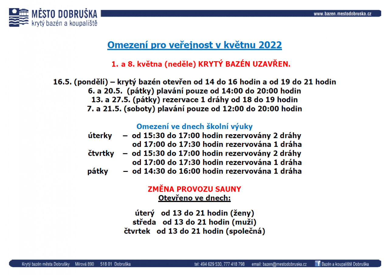 7. a 21.5. (soboty) plavání pouze od 12:00 do 20:00 hodin