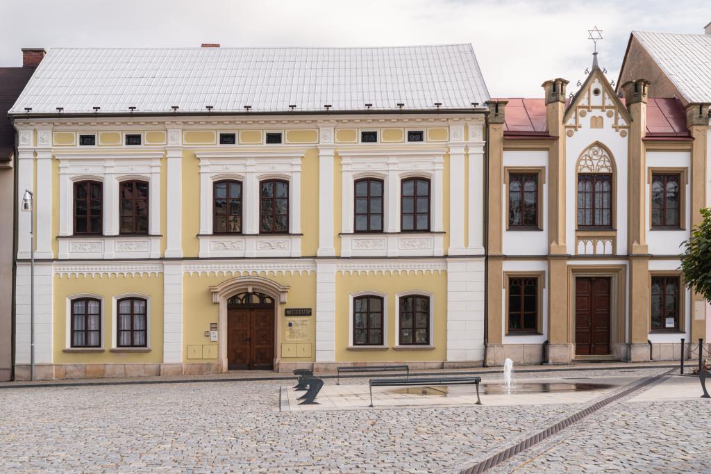 23 Dům čp. 45, Šubertovo nám. ‒ původně rabínský dům a židovská škola, později pošta, odkud vyšla mylná informace, na jejímž základě byl v Dobrušce již 5. října 1918 vyhlášen konec války a rozpad Rakouska-Uherska. Nyní je zde hlavní budova Vlastivědného muzea Dobruška s expozicí k dějinám města a dobrušských Židů. Součástí prohlídky je dochovaná očistná lázeň - mikve.