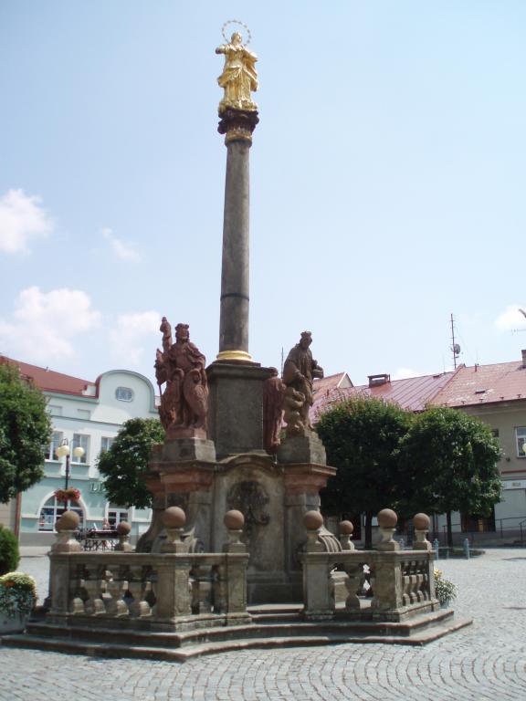 Sochařské dílo na náměstí F. L. Věka bylo vytvořeno z červeného a světlého pískovce v letech 1733 – 1736 královéhradeckým sochařem rakouského původu Ondřejem Deckerem a Janem Melnickým z Vamberka. Vrchol sloupu zdobí pozlacená socha Panny Marie Immaculaty. Kolem sloupu jsou umístěny sochy sv. Václava, sv. Jana Nepomuckého, sv. Floriána a sv. Františka Xaverského. Kamenný podstavec zdobí dvojitý erb rodů Colloredo-Wallsee a Starhembergů i znak města.