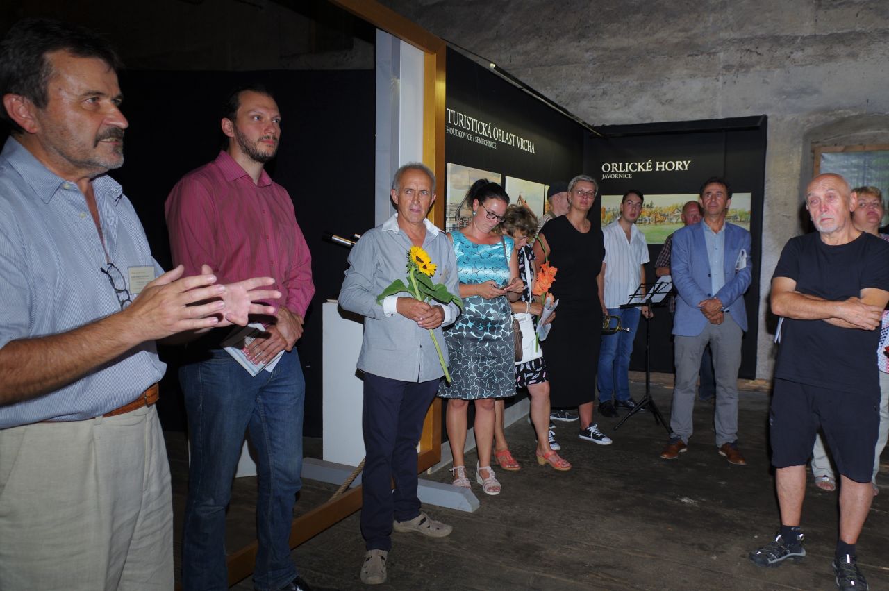 Velkolepé prostory opočenské Panské míčovny v sousedství zámeckého letohrádku patří v měsíci srpnu výstavě Po stopách Josefa Korejze Blatinského Rodným krajem Františka Kupky. Obrazy zachycující krásy kraje Orlických hor a Podorlicka, jak jej ztvárnil lidový umělec J. K. Blatinský, doplňují díla dobrušského řezbáře a sochaře Ladislava Cimrmana. Snímky jsou z vernisáže, která se uskutečnila v úterý 6. srpna.