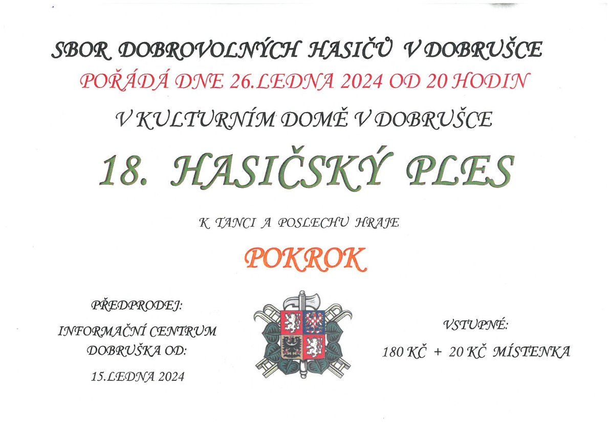 Sbor dobrovolných hasičů v Dobrušce pořádá dne 26. ledna 18. HASIČSKÝ PLES.