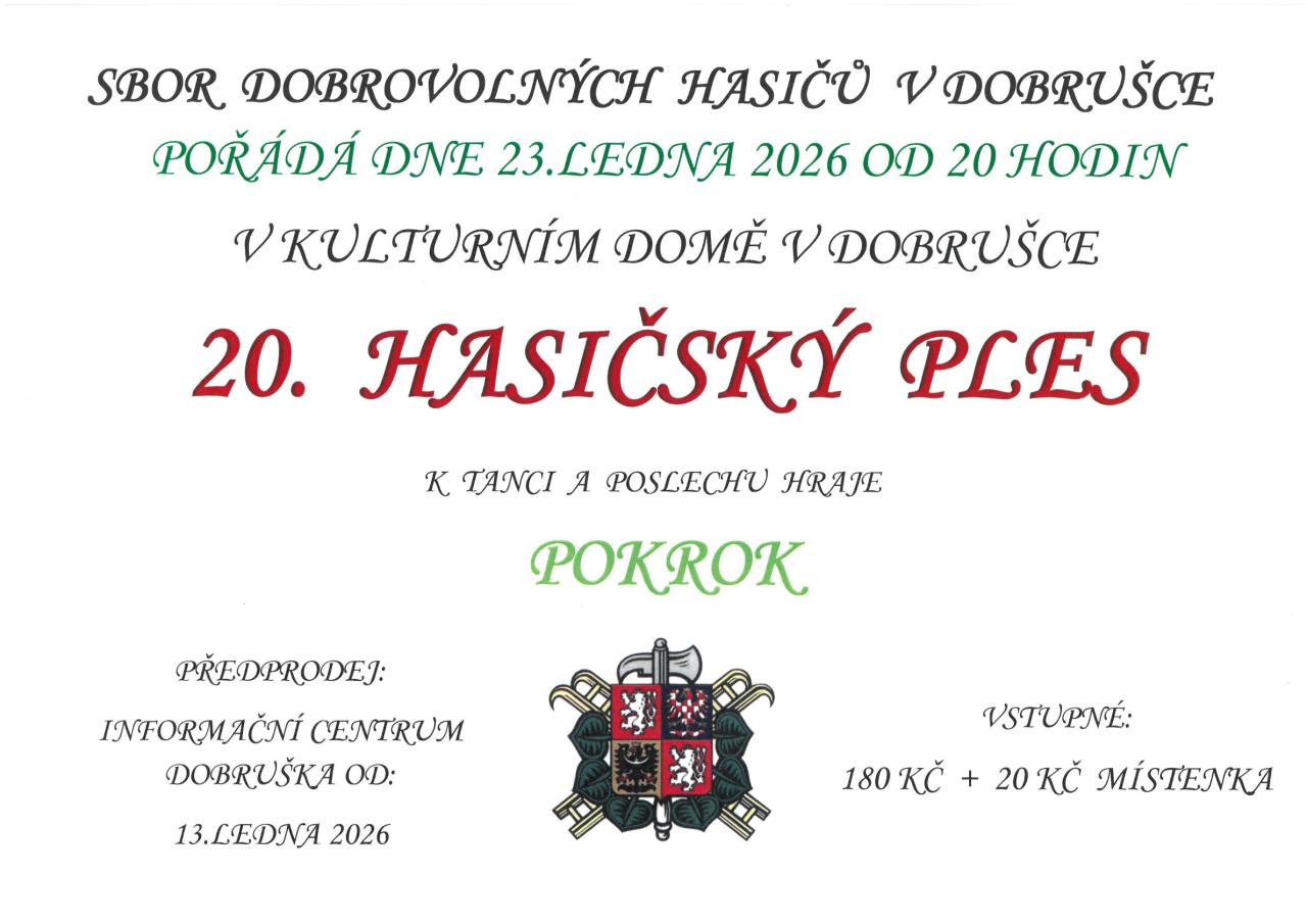 SBOR DOBROVOLNÝCH HASIČŮ v Dobrušce zve na 20. HASIČSKÝ PLES.