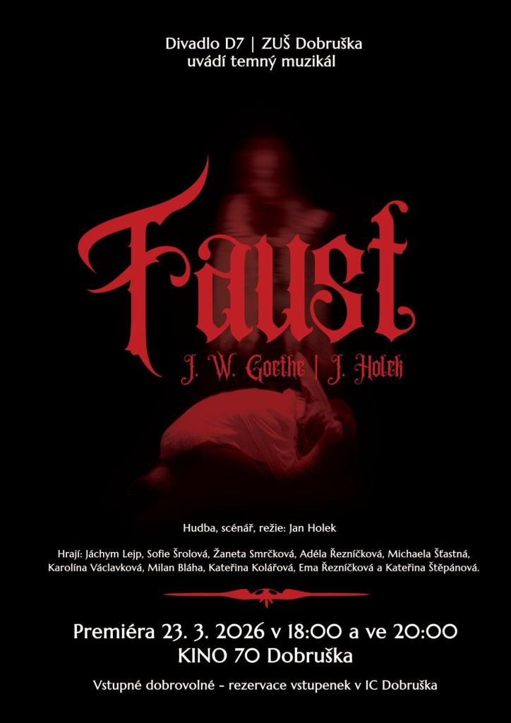 ZUŠ DOBRUŠKA uvádí temný muzikál FAUST. Hudba, scénář, režie: Jan Holek Hrají: Jáchym Lejp, Sofie Šrolová, Žaneta Smrčková, Adéla Řezníčková, Michaela Šťastná, Karolína Václavková, Milan Bláha, Kateřina Kolářová, Ema Řezníčková a Kateřina Štěpánová.