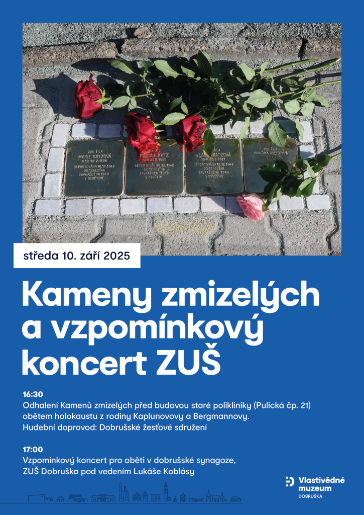 16:30 odhalení Kamenů zmizelých před budovou staré polikliniky obětem holokaustu z rodiny Kaplunovovy a Bergmannovy, hudební doprovod: Dobrušské žesťové sdružení