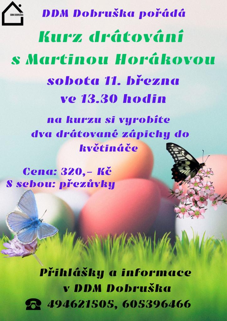 DDM Dobruška pořádá KURZ DRÁTOVÁNÍ S MARTINOU HORÁKOVOU. Na kurzu si vyrobíte dva drátované zápichy do květináče. cena: 320 Kč S sebou: přezůvky