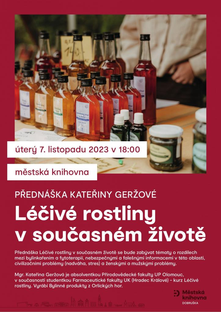 přednáška Mgr. Kateřiny Geržové se bude zabývat tématy o rozdílech mezi bylinkařením a fytoterapií, nebezpečnými a falešnými informacemi v této oblasti, civilizačními problémy