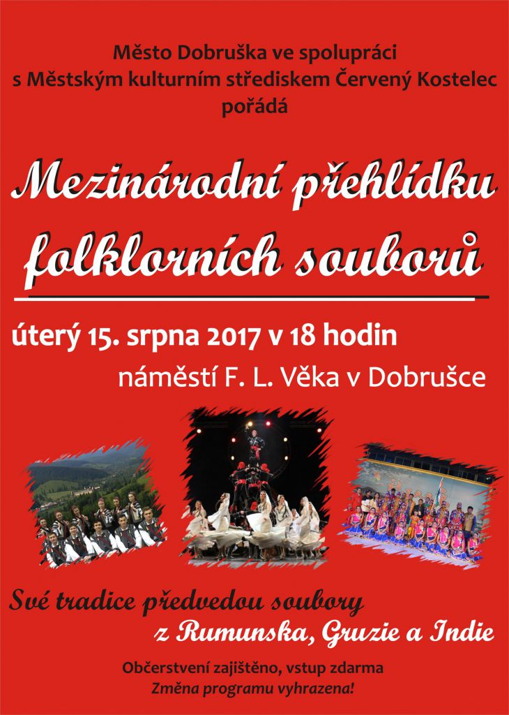 MEZINÁRODNÍ PŘEHLÍDKU FOLKORNÍCH SOUBORŮ v úterý 15. srpna 2017 v 18 hodin na Náměstí F. L. Věka v Dobrušce. Své tradice předvedou soubory z Indie, Rumunska a Gruzie. Občerstvení zajištěno, vstup ZDARMA. Změna programu vyhrazena.