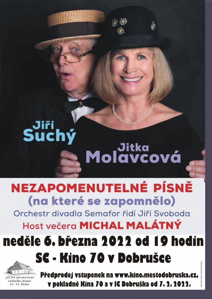 Jedna z velkých osobností české kultury, Jiří Suchý, se představí v dobrušském sále Kina 70. Společně s jeho dlouholetou kolegyní Jitkou Molavcovou nás pozve do zlaté éry Semaforu.