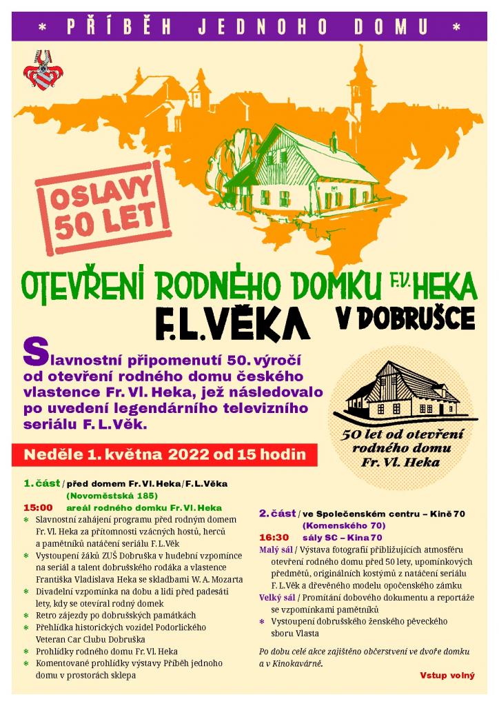 za přítomnosti vzácných hostů, herců a pamětníků natáčení seriálu F. L. Věk vystoupí v areálu rodného domku žáci ZUŠ Dobruška, slavný televizní seriál bude připomenut v podání místních amatérských souborů Divadelní spolek F. A. Šubert a Divadélko na štaflích